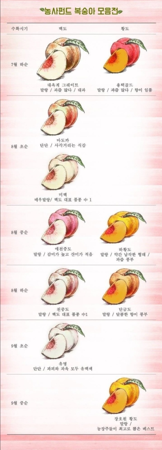 천중도는 백도의 끝판왕이라고 합니다. 후숙해서 드시면 말랑하고 부드러운 식감입니다. 천중도의 수확시기는 8월 중순경 수확해서 여름의 끝까지 즐길 수 있습니다. 과육은 유백색을 띄고 당고가 높고 신맛이 적습니다. 과육이 연해 쉽게 물러질 수 있습니다.