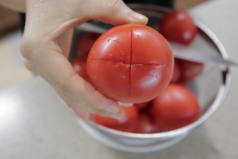 2. 토마토 끝부부에 +(십자모양) 칼집을 내고 끓는물에 살짝 데쳐줍니다.